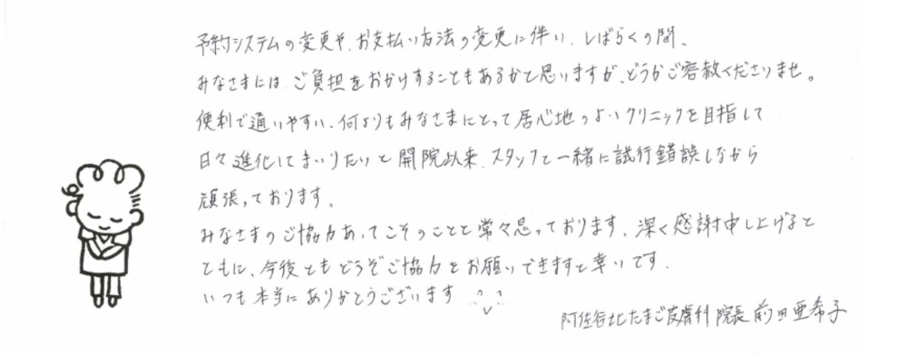 ほんとうにたくさんの関係者の皆様のご支援・ご協力をいただき、また、地元の商店街のみなさまにもあたたかく迎えていただきまして、開業させていただくこととなりましたこと、この場を借りて心から御礼申し上げます。今後ともどうぞよろしくお願いいたします。