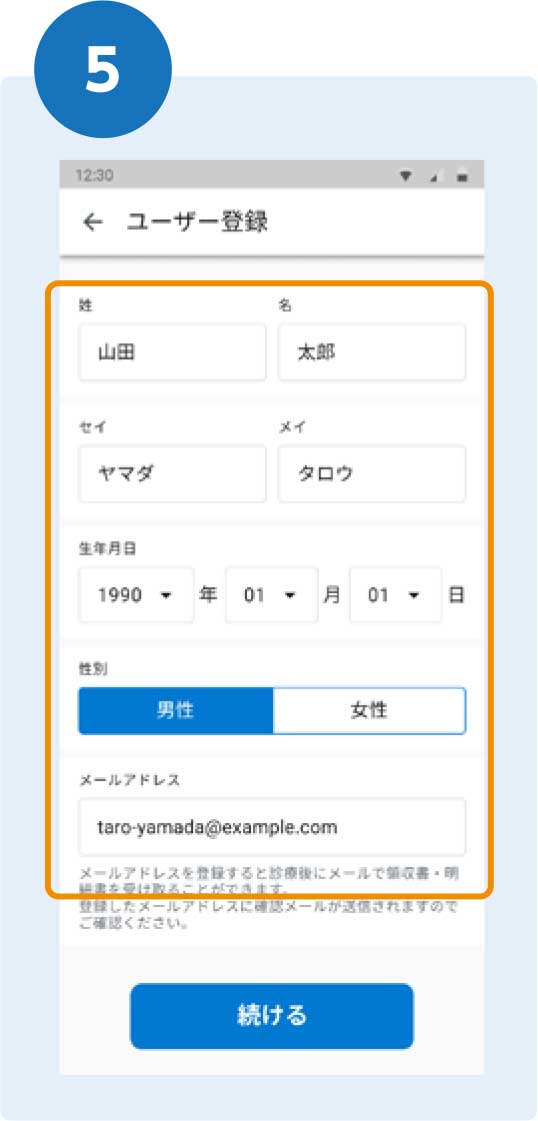氏名、生年月日、性別、メールアドレスを入力して「続ける」を押します。