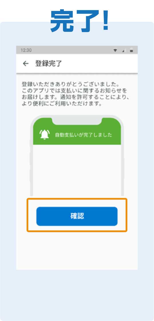 登録完了です。アプリからの通知を受け取る場合は「確認」を押し、ポップアップが表示されたら「許可」を押します。