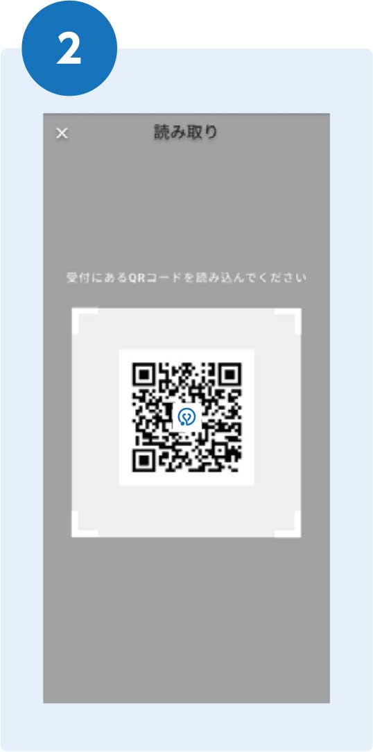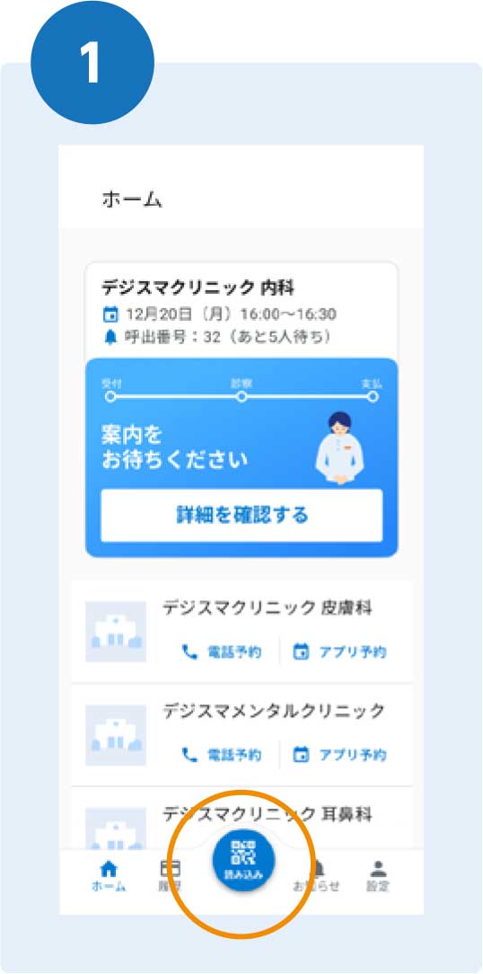 ご来院されましたら、受付にあるQRコードを「デジスマ診療」アプリで読み取ってチェックインしてください。
