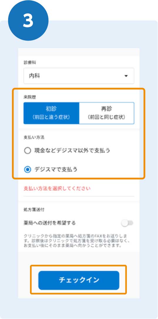 初再診、支払い方法を選択して「チェックイン」をタップします。