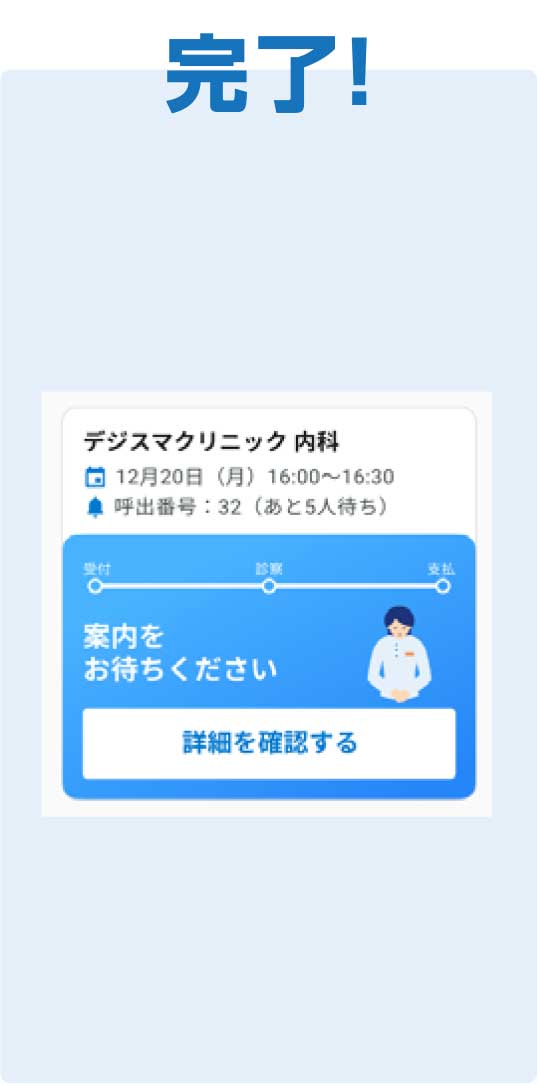 「デジスマ診療」は当日の順番どり・問診・窓口受付・会計までの全てをアプリ内で行えるため、