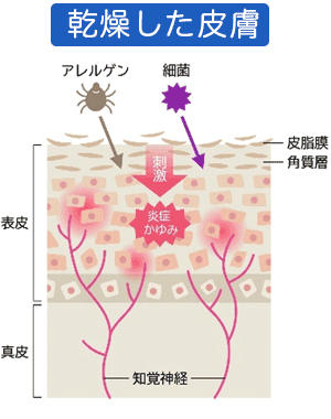 乾燥してバリア機能が低下すると、それだけで実は皮膚で軽い炎症が起き、乾燥が続くと痒みを感じる知覚神経(通常は皮膚の表面まで分布していません)が皮膚の表面まで伸びてきてしまいます。乾燥したお肌は、赤みがなくても目に見えない炎症が起きているためにかゆみが生じ、さらにかゆみを感じる知覚神経が表面にでてきてしまうとかゆみを感じやすくなり、ちょっとした刺激(衣服がすれる・温度差・ニットや髪の毛先のちくちくなど)でかゆみや炎症がが強くなってしまうのです。