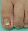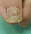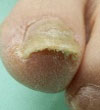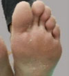 足白癬は、小さな水泡ができる小水疱型、足の指の間がふやけたりただれる趾間型、皮膚が固くガサガサひび割れる角質増殖型に分けられます。いわゆる水虫の症状としてわかりやすいのが、小水疱型や趾間型になります。放っておくと菌が爪に侵入し、増殖すると爪白癬となり、爪が白く濁ったり厚くぼそぼそとした爪になります。