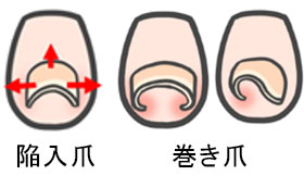 陥入爪は爪が皮膚に食い込んでいる状態で爪の両サイドや根元に爪が水平に食い込んで生じる変化で、巻き爪はクの字やU字にまがって皮膚に食い込んで生じる変化です。