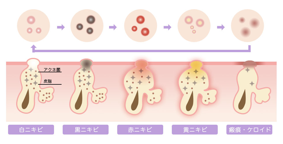 コメドの中にはアクネ菌が存在しており、増殖することでさまざまな炎症の引き金が連鎖します。炎症を引き起こすと、赤く腫れていわゆる赤いニキビになったり、さらに炎症が広がることで膿が溜まって黄色いニキビになったり、毛穴の壁がこわれて周囲にも強い炎症が波及したりします。赤いぶつぶつや黄色いぶつぶつになると、いわゆる「ニキビ」として自覚できる状態になります。