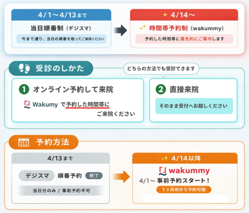 当院では、患者さまが少しでも快適に通院できるよう日々スタッフと話し合いながら診療体制の改善を行っています。今回の予約システムの変更も、定期的な通院がよりしやすくなることを目的としています。新しいシステムに慣れるまでの間、待ち時間や院内の流れなどでご不便をおかけする場合もあるかもしれません。より良い診療環境を目指してまいりますのでご理解とご協力をいただけますと幸いです。